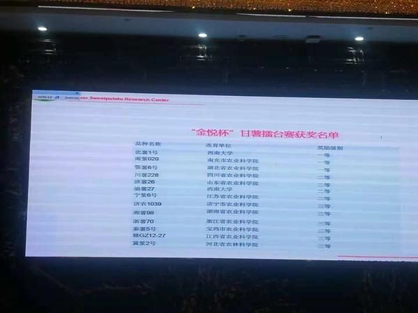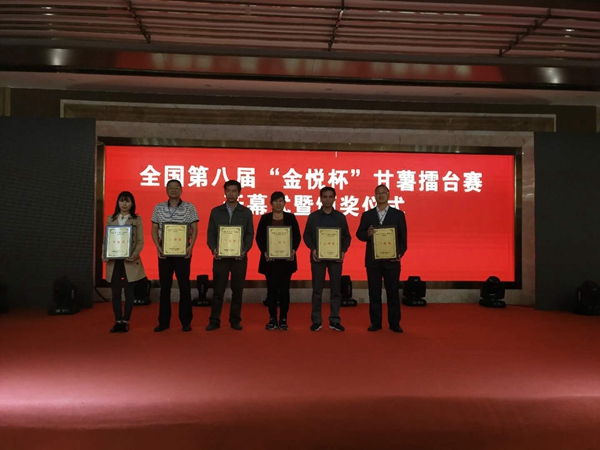 10月10日,全国第八届“金悦杯”甘薯擂台赛在湖北省随州广水市湖北金悦农产品开发有限公司甘薯种植基地打响,本次擂台赛由国家甘薯产业技术研究中心、湖北省农业厅、湖北省科技厅、湖北省农业科学院、广水市人民政府主办,湖北金悦农产品开发有限公司承办。今年,国家甘薯产业技术研发中心在全国筛选了48个甘薯品种,由位于广水的湖北金悦公司统一种植,统一管理。国内14名知名专家对参赛的48个甘薯品种和产品的产量、品质、外观等进行综合评奖,评选出13个优质品种,我院选育的甘薯新品种济农1039列第八位,荣获三等奖。